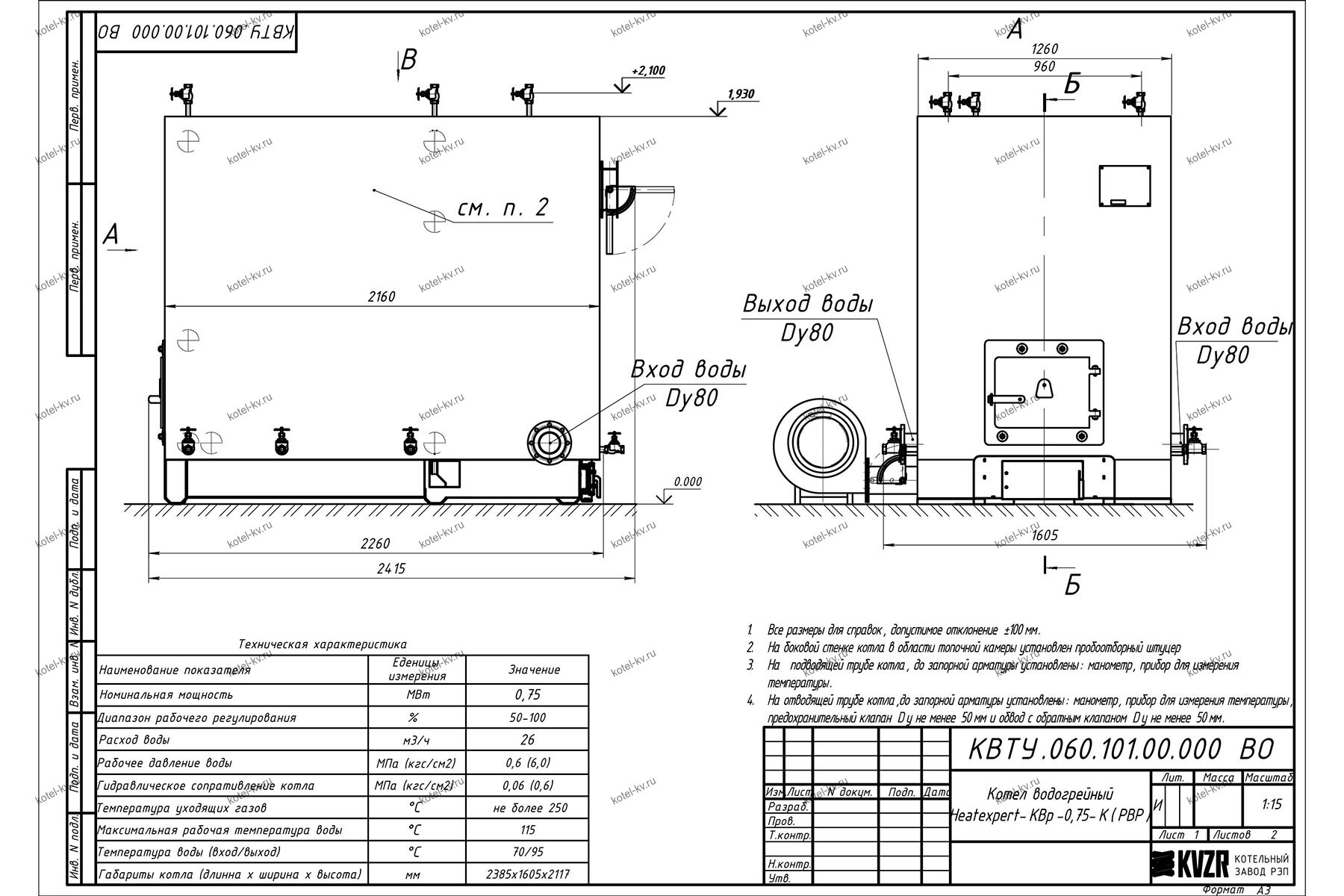 Водогрейный котел КВр 0 75 МВт всегда есть в наличии на складе завода производителя, действующая цена указана на сайте, стоимость установок по техническому заданию заказчика рассчитывается под заказ. Возможные варианты изменения устройства модели - корректировка габаритных размеров, изменение места подвода и выхода теплоносителя, изменение размеров и расположения загрузочного окна и подобное. Производство отопительных котлов мощностью 0.75 МВт по техническому заданию завод осуществляет в течении 10-20 рабочих дней.
